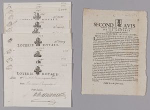 - Petit imprimé 1 p. in-4 : « Second avis pour le mois de juin 1729 de la loterie accordée en faveur de plusieurs communautez religieuses ».
