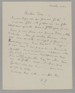 « Ma chère Irène, Pourquoi croyez-vous que Jean est fâché ? C'est une folie et j'espère que ma folie était aussi grande quand je vous croyais fâchée. Comme je vous plains, ma pauvre Irène, d'être malade. Mais je suis bien heureux de ce que vous me dites au sujet d'Auric. Reviendrez-vous tous bientôt ? Serge [Férat] est-il avec vous ? Moi je reviendrai à Paris vers le 10 octobre. Je ne sais pas encore si je pourrai aller chez Lucien, en Touraine [Daudet y possédait le château de Chargé]. Tout dépendra du temps. Je ne vous en écris pas plus long, ma chère Irène, car le facteur arrive, et après, il me faudrait attendre lundi pour vous envoyer la lettre. Guérissez bien vite, ma chère Irène. R.R ».