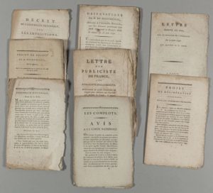 - « Les complots : avis à la Garde Nationale », par H... (Citoyen actif). Cahier imprimé à l'Imprimerie de la Feuille du Jour, rue Mêlée, 8 pages.