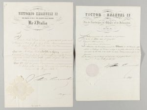 VICTOR-EMMANUEL II (1820-1878), roi d'Italie. 2 pièces signées. Turin, 18 juillet 1856 et 22 mai 1864. 2 pp. grand in folio. En français et en italien. Deux grands sceaux gaufré sous papier.