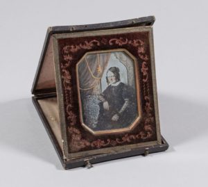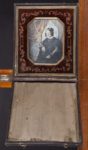 Daguerréotype colorisé, monté dans un encadrement de velours et disposé dans un écrin amovible pouvant se déployer en cadre de présentation et portant à l'intérieur l'étiquette imprimée indiquant « Daguerréotype par Monsieur Le Pescheur de Lyon »