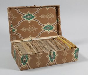 L'ensemble conservé dans une boîte d'époque en bois recouvert d'un remarquable papier peint à motif géométrique