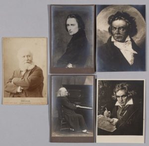 Réunion de cinq (5) épreuves, dont un extraordinaire portrait de Franz Liszt au piano par Louis HELD (1851-1927), épreuve argentique contrecollée sur carton et légendée au dos en Allemand ; Charles Gounod par CHALOT épreuve argentique contrecollée sur carton ; reproduction d'un portrait peint de Franz Liszt jeune par Louis HELD, deux reproductions de portraits peints de Beethoven