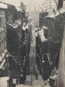 Lyon, perspective sur l'église Saint-Nizier depuis la montée du Change enneigée, circa 1935