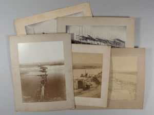 Réunion de cinq (5) tirages, trois albuminés et deux citrates montés sur carton, signés et datés dans le négatif, nombreuses indications techniques au crayon sur les cartons de montage