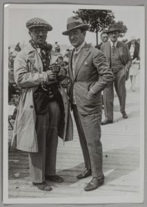 Tirage argentique d'époque à destination de la presse, légende tapuscrite : « A Deauville, deux célébrités sur les planches, le fameux peintre japonais Foujita à gauche, et notre populaire Biscot (à droite) ont le sourire » et crédit du photographe au dos