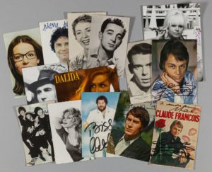 Fort lot comprenant plus de 120 documents, photographies, cartes-postales, cartes promotionnelles, dont de nombreux dédicacés, offrant un formidable panorama de la variété et de la chanson françaises des trente glorieuses et quelques vedettes de cinéma, dont Claude François, Carlos, Jacques Dutronc, Jacques Brel, Dalida, Les Charlots, Los Machucambos, Isabelle Aubret, Thierry Le Luron, Guy Bedos, Sophie Daumier, Nicoletta, Serge Lama, Charles Aznavour, Pierre Perret, Les Compagnons de la Chanson, Annie Cordy, Adamo, Michèle Torr, Claude Luter, Mick Micheyl, Claude Goaty, Nana Mouskouri, John William, Stone & Charden, Sacha Distel, Enrico Macias, Michel Piccoli