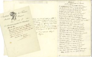 Étienne AIGNAN (3, 1801-1818, à Fontanes, Pongerville), François ANDRIEUX (5, plus poème autogr. de 236 vers, Discours sur la perfectibilité de l'homme), Antoine-Vincent ARNAULT (5, 1813-1826, une à Babeuf fils ; et poème autogr. Fable Ve. L'Artichaut), Louis-Simon AUGER (3, 1828), Joseph AUTRAN (10, 1838-1876, notamment au directeur du Théâtre Français et au Prince Louis-Napoléon pour La Fille d'Eschyle), Pierre BAOUR-LORMIAN (7, à Étienne, Laya et un quatrain a.s.), Prosper de BARANTE (7, 1814-1959, une au comte d'Artois), Auguste BARBIER (4 à Cuvillier-Fleury, 1864-1872, et 2 poèmes a.s., Soleil et Lune, et La Curée extraite des Iambes), Louis-Gabriel de BONALD (1823), Vincent CAMPENON (4, et poème autographe, Au saule de Ducis), Victor COUSIN, Joseph DROZ (8, 1803-1842), Louis-Emmanuel DUPATY (1823 sur Rossini, et poème autogr. qui devait être lu après sa mort), Alexandre DUVAL (5, 1824-1832), Prosper DUVERGIER DE HAURANNE (22, 1825-1876, à Salvandy, Andral ; 2 mss a.s., canevas d'article pour le Globe, et note pour son discours de réception sur V. de Broglie), Adolphe EMPIS (2, 1833-1859), Joseph ESMÉNARD (5 ; plus doc. familiaux), Charles-Guillaume ÉTIENNE (5, 1813-1828, à Boieldieu, Martinville, et ms a.s.).