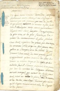 Le brouillon présente d'importantes ratures et corrections, avec plusieurs passages barrés. La mise au net, soigneusement calligraphiée d'une grande écriture, avec cependant quelques corrections, a dû servir pour la lecture.