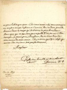 19 mai 1722, [à l'abbé Joseph d'OLIVET], belle lettre le complimentant de son livre Huetiana, [ou Pensées diverses de M. HUET], qu'il a loué « mesme dans l'Academie Françoise » et qu'il conservera précieusement, « et pour l'amour de vous [], et en mémoire du sçavant homme dont vous avez recueilli les paroles. Il avoit autrefois pour moy quelque bonté. Peut-être que l'amitié dont m'honoroit M. DESPREAUX me rendit suspect dans la suite » 8 août 1724. M. de VALINCOURT et lui ont lu et relu l'exemplaire confié, et il adresse ses propres pièces en demandant grâce pour elles, « tres petites compagnes » et « humbles servantes de vostre belle traduction
