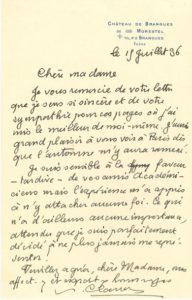 Tientsin 13 septembre 1907, à André RUYTERS à Bruxelles : longs conseils pour entrer à la Banque de l'Indo-Chine, et réserves du catholique sur son livre Le Mauvais Riche : « Où est votre goût, si le sel de la terre a perdu toute saveur pour vous ? » Hambourg 18 juillet 1914, à André SILVAIN : son article du Figaro « a déjà fait quelque bruit » ; il le recommande à son ami Philippe Berthelot pour la Société de Bienfaisance Tokyo 23 octobre 1923, au même, qui souhaite acquérir un exemplaire de luxe de Sainte Geneviève Paris 12 janvier 1926 : pouvoir au peintre José-Maria SERT de traiter en son nom pour l'édition illustrée de luxe du Soulier de satin Washington 9 mars 1933, à Frédéric LEFÈVRE, réclamant des nos des Nouvelles littéraires. 11 janvier 1936, [au cardinal BAUDRILLART], renvoyant un livre du P. Condamin à l'Institut Catholique, auquel il souhaite « le plus grand développement et illustration de l'Institut que vous dirigez glorieusement »... Brangues 15 juillet 1936, à Mme Vera BOUR, la remerciant de sa « sympathie pour ces pages où j'ai mis le meilleur de moi-même. [...] Je suis sensible à la faveur tardive de vos amis Académiciens mais l'expérience m'a appris à n'y attacher aucune foi. Ce qui n'a d'ailleurs aucune importance, attendu que je suis parfaitement décidé à ne plus jamais me représenter ! »...