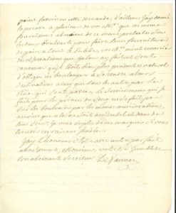 16 janvier 1771, expliquant l'interdiction de la circulation sur les nouveaux boulevards des charrettes, qui doivent emprunter les rues pavées 12 avril 1773, à son ami NARDOT, au sujet du neveu de M. Bruté. 18 avril 1776, à la comtesse de MAULDE, envoi du prix de son diamant « pris dans la confiscation des biens de M. De Lally » 26 décembre 1792, à un collègue, à propos de « l'arrangement définitif avec le conseil Penthievre, que devenoit l'affaire si le décret n'eût été rapporté et que M. de Penthievre eût été forcé de s'en aller » 29 messidor IX (18 juillet 1801), recommandant à un ministre pour une place d'agent de change le citoyen JOUBERTON, « très intelligent et recommandable par le sacrifice qu'il a fait d'une partie de sa fortune pour satisfaire à des engagemens qu'il eût pu éluder en suivant de bien nombreux exemples » Etc.