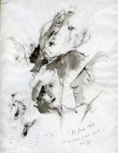 L'Académie discutant sur le mot « con », encre et lavis, avec légende autographe et date : 16 février 1967 (16 x 20 cm).