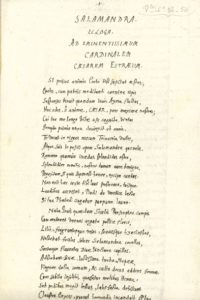 HUET Pierre-Daniel (1630-1721) prélat, érudit et écrivain, ami et collaborateur de Mme de Lafayette ; sous-précepteur du Dauphin et évêque d'Avranches [AF 1674, 21e f]. POEME autographe, Salamandra. Ecloga, [1709] ; 4 pages petit in-4 ; en latin.