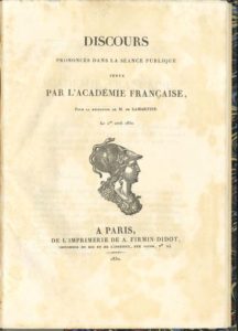LAMARTINE Alphonse de (1790-1869) [AF 1829, 7e f]. Discours prononcés dans la séance publique tenue par l'Académie française pour la réception de M. de Lamartine, le 1er avril 1830 (Paris, impr. Firmin-Didot, 1830) ; plaquette grand in-8, rel. bradel demi-percaline grise.