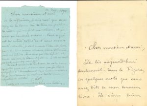 LOTI Pierre (1850-1923) [AF 1891, 13e f]. 2 L.A.S. « P. Loti » et « Pierre Loti »,1890-1891, à Philippe GILLE du Figaro ; 1 page in-12 avec adresse et marques postales (télégramme) et 2 pages in-8.