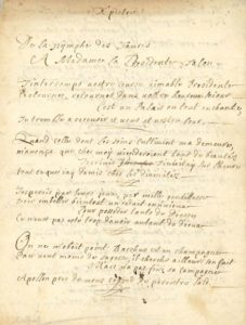 MALLEVILLE Claude de (1597-1647) poète, secrétaire du maréchal de Bassompierre, puis secrétaire du Roi ; il s'était opposé à la fondation de l'Académie, dont il fut cependant un membre fondateur [AF 1634, 8e f]. MANUSCRIT autographe, Epistre de la Nymphe des Fauves A Madame la Presidente Talon ; 3 pages in-4.