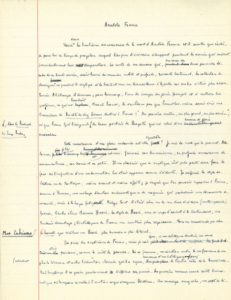 Maurois se réjouit de voir l'oeuvre d'Anatole FRANCE quitter enfin le purgatoire où elle était confinée. Il explique que dès l'adolescence, il a aimé « son humanisme, sa profonde connaissance des anciens auteurs, son ironie et sa pitié », et s'il préférait le style de BARRÈS, « l'intelligence de France me semblait plus rigoureuse ». Son scepticisme et son humour masquaient un coeur passionné et un militantisme efficace. Maurois évoque ensuite les deux livres les plus importants de l'écrivain, L'Île des Pingouins et Les Dieux ont soif qu'il considère comme un chef-d'oeuvre, et invite à relire Anatole France... On joint le tapuscrit corrigé.