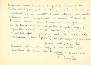 Il remercie La Varende de son article dans Artaban (reproduction jointe) : « Ce qu'un homme de coeur avait à dire, ce qu'un magnifique esprit sait exprimer, je le lis [] sous votre signature : j'en suis ravi et touché, au delà de tout. Au lendemain d'un échec, vous en souvient-il, je vous ai écrit : "Vous n'avez pas besoin de l'Académie, si elle a besoin de vous." À mon tour, me contredisant, j'y fus. Non pas par faiblesse et vanité, mais pour démontrer à ceux qui m'y poussaient qu'ils faisaient fausse route. Ce fut mon seul succès, mais réel. J'avais raison. Ils ont si fidèlement voulu me servir, au prix de tourments sans nombre, qu'ils y ont perdu un hiver, à l'hiver de leur vie. Maintenant, je suis content d'avoir retrouvé ma vérité d'homme seul, indépendant et ennemi déclaré des honneurs. Heureux aussi d'avoir mis des gens, qui se disent écrivains, en posture de politiciens, d'épurateurs attardés et de barbichus (ils font aujourd'hui, après un quart de siècle, du national-socialisme, ces deux Églises !) complexards-inférioritaires »...