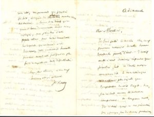 Il remercie son correspondant de sa « bonne & cordiale parole d'hier », mais réfute l'imputation. « Non, je n'ai fait aucune stipulation avec personne. M Campenon mort, j'ai déclaré que je ne me présentais pas, parce que, sans des chances prochaines, il me semblait insupportable de m'établir en candidature permanente. Si j'avais voulu arriver à une stipulation, je me serais mis en campagne, j'aurais formé un noyau plus ou moins considérable, et je ne me serais désisté que moyennant arrangement et conditions. Or j'ai fait tout le contraire : dès le premier jour j'ai dit non et me suis tenu dans ma chambre ». Saint-Marc Girardin, dont il aurait pu empêcher l'élection, est venu le remercier pour ses bons procédés... « Quant à ma candidature actuelle, je ne m'y suis décidé que parce qu'il m'importe d'éclairer cette situation gênante dans laquelle je suis sur le seuil et presque logé dans le mur de l'Académie ». Suivent des explications sur les voix qu'il a recueillies, sans pour cela mettre en jeu ni sa dignité ni sa fierté...