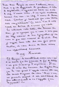 YOURCENAR Marguerite (1903-1987) [AF 1980, 3e f] ; elle fut la première académicienne. L.A.S. « Marg. Yourcenar », Bruxelles 14 décembre 1930, à Jean ROYÈRE ; 3 pages petit in-4 sur papier mauve, enveloppe.