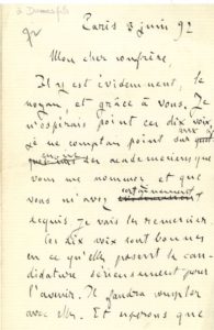 ZOLA Émile (1840-1902). L.A. (brouillon), Paris 3 juin 1892, à un « cher confrère » …