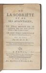 CORNARO (Luigi) — De la sobriété et de ses avantages. Paris, Edme, 1772. — In-12 (15,5 x 9,2 cm), cartonnage de chagrin noir, dos lisse avec étiquette (reliure moderne). — XII p., 160 p.