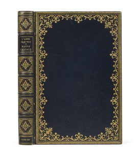et au pointillé), dos à nerfs orné, tête dorée, cadre intérieur de maroquin bleu nuit orné de rinceaux et fers d’angle dorés, doublures et gardes de soie brochée à motif floral dans les tons bleu et rose, couvertures et dos conservés (H. Blanchetière). — XXII p., [1] f., 203 p., [2] ff.