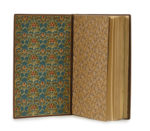 – SOULIÉ (Frédéric). Le Lion amoureux. Paris, Librairie L. Conquet, 1882. In-12 (18,3 x 11,9 cm), reliure janséniste maroquin marron, dos à nerfs, doublures entièrement ornées d’un décor floral doré et mosaïqué de chagrin bleu canard, vert mousse et rouge, tranches dorées, gardes de soie brochée, couvertures et dos conservés (J. Bretault).