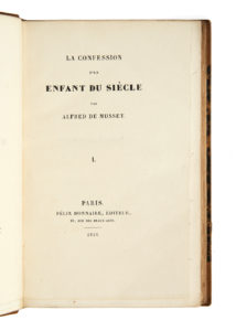 MUSSET (Alfred de) — La Confession d’un enfant du siècle. — Paris, Félix Bonnaire, 1836. — 2 vol. pet. in-8 (22,1 x 13,9 cm), demi-veau fauve à coins, dos lisse orné en long de motifs dorés, pièces de titre marron, têtes ébarbées,...