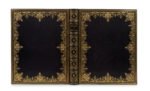dentelle de motifs dorés, dans le goût du XVIIIe s., dos à nerfs orné de même, encadrement intérieur de motifs dorés, doublures et gardes de soie brochée de motifs végétaux, tranches dorées (Noulhac 1942).