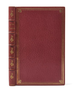 rouge, dos à nerfs orné en accord avec les plats, tranches dorées, cadre intérieur de maroquin rose orné d’une frise dorée, doublures de maroquin vert sapin, gardes de maroquin cerise, chemise et étui (G. Levitzky). — [2] ff., 107 p.