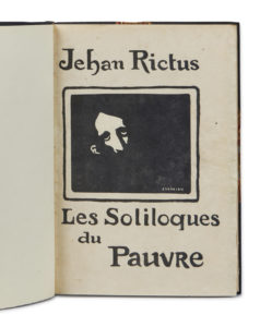 [STEINLEN].– RICTUS (Jehan) — Les Soliloques du pauvre. — [Paris], chez l’auteur, 1897. — In-8 (24,4 x 16,7 cm), demi-maroquin anthracite à coins, dos à nerfs, tête dorée, premier plat de couverture conservé (Devauchelle).