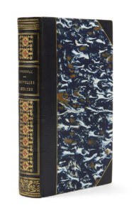 STENDHAL (Henri Beyle, dit) — Nouvelles inédites. — Paris, Michel Lévy frères, 1855. — In-12 (18,5 x 10,9 cm), demi-veau à grain long bleu nuit à coins, dos lisse richement orné dans le goût romantique de motifs dorés et mosaïqués,...
