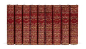 TALLEMANT DES RÉAUX — Les Historiettes. — Paris, J. Techener, 1854. — 9 vol. in-8 (23,1 x 15 cm), maroquin grenat, trois filets dorés en encadrement des plats, médaillon central fait de fins motifs dorés, dos à nerfs orné de motifs...