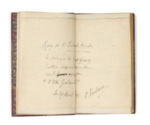 Exemplaire enrichi d’un billet autographe signé de Verlaine : « Reçu de l’ “Écho du Monde” la somme de vingt francs contre reproduction de cent [francs] vers des “Fêtes Galantes”. Le 24 avril 1891. »