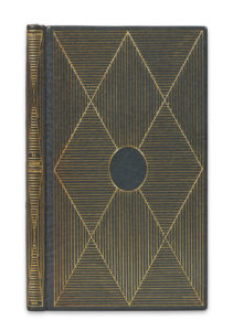 central en réserve, dos lisse orné d’un rappel du décor, doublures bord à bord de maroquin rouille ornées de filets dorés en encadrements, agrémentés de quatre losanges striés de filets horizontaux, gardes de soie moirée saumon, couvertures et dos conservés, chemise, étui (Gruel). — 1 f. bl., [2] ff., 38 p., [1] f, 1 f. bl.