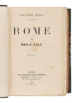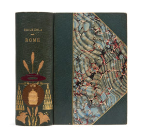 ZOLA (Émile) — Rome. — Paris, Charpentier et Fasquelle, 1896. — In-12 (18,5 x 11,7 cm), demi-bradel vert bouteille à coins, dos lisse avec décor mosaïqué imitant des armes cardinalices et papales (chapeau de cardinal et tiare) en maroquin...