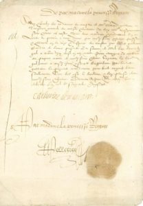 CATHERINE DE BOURBON (1559-1604) Infante de Navarre, sœur d'Henri IV. P.S. « Catherine de Navarre », Pau 21 octobre 1577 ; contresignée par PELLETIER ; 1 page in-fol., sceau aux armes sous papier.