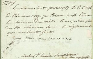 Billet à ordre : « Le prémier may je paierai à M. Pême la somme de mille livres, à compte de son mémoire, sauve le règlement qui en serat fait »… La comtesse Du Barry a ajouté : « approuvé l'écriture cy-dessus - bon pour 1000ll ». Le billet a été endossé par le bénéficiaire Pesme en faveur de Mme La Rivière le 30 janvier 1787, et acquitté par celle-ci ; la signature de Mme du Barry a alors été biffée.