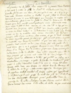 Récit de sa journée du 14 juillet 1789. Parti à pied de la rue de Grenelle, il arrive au bac des Invalides, puis à la grille de Chaillot « sans autre rencontre que celle de deux ivrognes. » Il apprend d'un « concierge que la populace vouloit brûler la maison voisine, qui appartenoit à la ferme,[…] qu'il étoit un des 800 bourgeois convoqués pour patrouiller dans la paroisse de la Ville-l'évêque. Ces 800 citoyens avoient été se faire donner des armes à la ville » La veille, parti peu avant minuit, en berline escortée par des gens à cheval, il a vu à la Barrière, brûler des meubles « allumés en dehors des batimens » et a été arrêté par « par un grouppe de 6 à 7 vagabonds dont un seul armé d'un long pal » ; après avoir répondu qu'ils étaient du tiers état et leur avoir donné un écu de 6 livres, ils ont pu continuer leur route. « Pour éviter le Boulevard de la porte S. Martin, nous avons été par Chaillot jusqu'à la porte de S Denys. Là, nous avons trouvé un petit camp de 8 ou 10 petites tentes, avec deux sentiinelles du Régiment de Paris. La porte etoit gardée par une douzaine de soldats. Nous n'avons rencontré sur notre route que des cocardes vertes. Nous avons traversé Pantin où tout a paru tranquille et nous sommes arrivés au Rinci sur les dix heures du matin. »