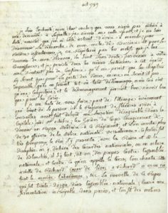 Il se hâte « de vous faire part de l'étrange événement qui vient de se passer ici ». Le régiment de Flandres, arrivé à Versailles, y a organisé un repas militaire. « Ce festin fut très pompeux, le Roi s'y présenta, avec la Reine et le Dauphin. « On y déchira des cocardes nationnales, on en arbora de blanches, il s'y tint, dit-on, des propos contre l'assemblée nationale et contre ce qu'on appelle le tiers », on y chanta des hymnes royalistes, etc. Ce repas fut traité d'orgie à l'Assemblée nationale, et « causa une fermentation incroyable dans Paris ». Mirabeau le dénonça, mais les aristocrates se réjouissaient de cette « contre-Révolution » et du refus du Roi d'accepter la Constitution. Pendant ce temps « le pain manquoit toujours à Paris » ; tout cela causa de grands mouvements dans Paris dès le dimanche soir. On arracha les cocardes noires « à nombres d'élégans qui l'avoient reprise », on ordonna de reprendre la cocarde tricolore, « on sonna le tocsin, on battit la générale. Les femmes se portèrent enn foule à l'hotel de ville où sans qu'on leur opposat aucun obstacle, elles enlevèrent des fusils et des munitions ». À plus de quatre mille, elles marchèrent sur Versailles guidées par Hulin et Maillard « qui s'étoient signalés à la prise de la Bastille ; on assure qu'il y avoit des hommes, des soldat déguisés parmi les nouvelles amazones »… À Versailles, elles se rendent d'abord à l'Assemblée Nationale, où Maillard fait un discours menaçant, réclamant du pain ; puis ces dames votent, et Mirabeau qui s'oppose à ce vote, « a même été menacé d'être lanterné »… Ensuite, une députation de douze dames « accompagnées de quelques députés, se sont rendues vers le Roi » pour parler de l'importante question de l'approvisionnement de la capitale. Le Roi donne des ordres, transmis immédiatement à l'Hôtel de Ville. Pendant ce temps, « il arrivoit des milliers de femmes à Versailles, des phalanges des faubourgs Saint-Marceau et Saint-Antoine armées de piques longues de 8 à 9 pieds. Le Régiment de Flandres, les Dragons et la Milice de Versailles ont reçu les amazones aves des battemens de main et des cris de joye », ce qui a fortement déconcerté l'aristocratie, qui pensait depuis le fameux banquet qu'ils feraient feu sur la foule ; mais le Roi refusa d'en donner l'ordre… Il ne restait pour protéger le château que 3 ou 4 compagnies de Gardes Suisses et 600 gardes du Corps (censés protéger la famille royale), et ceux-ci s'opposèrent aux femmes qui tentèrent d'envahir le château. Certaines furent blessées. C'est alors que la milice de Versailles a fait feu avec les Gardes du Corps dont 2 ou 3 furent tués : « Leur têtes ont été coupées et portées au bout d'une pique au Palais Royal. […] alors les grilles du château ont été forcées et les salles innondées par les piquiers et les amazones. Il ne paroit pas qu'on s'y soit alors porté à aucun autre excès. Cependant la terreur étoit générale, les dames mettoient leurs diamans en poche et se préparoient à la fuite. ; la salle des états étoit toujours bigarrée d'une foule de nouveaux représentans, et la séance duroit toujours »… Cependant à Paris la Milice nationale voulait aller à Versailles chasser le régiment de Flandres. M. de Lafayette s'y opposant fortement, « les Grenadiers lui ont appuyé 5 à 6 bayonnettes sur sa poitrine, le peuple lui a parlé Lanterne ». Il accepte dès que la Commune en donne l'ordre, alors « 15 mille hommes, avec une douzaine de canons, sont partis tambours battant, enseignes déployées, ayant M. de La Fayette à leur tête […]. La nouvelle de cette marche a semé l'épouvante dans Versailles ». Mais le roi a assuré qu'il recevrait Lafayette sans opposition, et celui-ci a pu parler au Roi « avec beaucoup de sensibilité et de noblesse », lui demandant que les troupes du château soient remplacés par la Garde nationale : « Cette demande a été aussitôt accordée, et les Parisiens se sont emparés de tous les postes. […] La visite de notre Commandant Général a remis beaucoup de calme dans les château, […] la famille royale n'a dû sa sureté qu'aux soins vigilans de M. de La Fayette et à la fermeté des Gardes nationnales ; on croit […] que les hordes des faubourgs se seroient, sans mesures plus sages, portées aux plus affreuses extrémités »… Quelques gardes furent cependant égorgés presque sous les fenêtres du roi. Plusieurs fois on a exhorté la Reine à prendre la fuite, mais celle-ci s'est montrée inflexible, ne voulant pas abandonner son époux. Elle a dit « avec beaucoup d'énergie, je sais le sort qui m'attend, mais je ne me séparerai jamais du Roi et de mes enfans