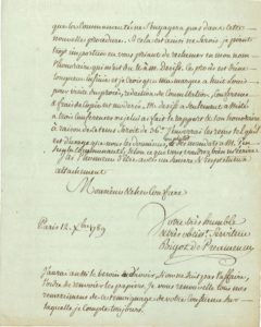 Paris 23 mai 1791, à PALLOY,« Architecte entrepreneur ». Il le remercie au nom des juges, commissaire et greffier du tribunal du 4earr. du présent « d'une pierre de trois pieds environ de longueur sur deux de large provenant de lademolition de la Bastille et sur laquelle sont gravés les portraits du Roi, du ministre de la justice etdiverses inscriptions. Il ne sauroit être rendu au Tribunal un hommage plus flatteur que celui qui aété inspiré par le patriotisme »...