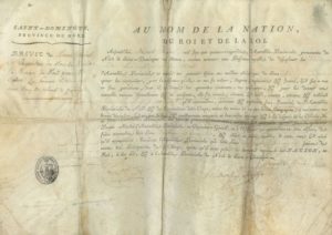 AINT-DOMINGUE. Jean-Jacques BACON DE LA CHEVALERIE (1731-1821) colon de Saint-Domingue, oncle maternel de Barnave, il fut président de la première Assemblée provinciale du Nord de l'île et un virulent esclavagiste. P.S. comme président,cosignée par 2 membres de l'Assemblée Provinciale, Le Cap 8 janvier 1790 ; vélin oblong in-fol. en partie impr., en-tête Saint-Domingue, Province du Nord, cachet encre CapSalus Populi Suprema Lex Esto (encre un peu passée).