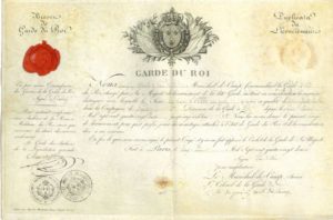 Montpellier 7 septembre 1791 (demi-page in-fol.), certificat pour un sous-lieutenant du 8e bataillon d'Infanterie légère. Paris 5 juin 1792 (vélin oblong in-4 en partie gravé, vignette aux armes royales, cachet de cire rouge), beau Brevet de Garde du Roi, duplicata de licenciement. On joint un manuscrit, Vers chantés à Mr de Précy (3 p. in-8). Ancienne collection Patrice Hennessy.