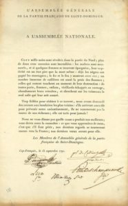 Rare lettre ouverte à l'Assemblée Nationale sur la révolte des esclaves. « Cent mille noirs sont révoltés dans la partie du Nord ; plus de deux cens sucreries sont incendiées : les maîtres sont massacrés, et si quelques femmes se trouvent épargnées, leur captivité est un état pire que la mort même : déjà les nègres ont gagné les montagnes ; le fer et le feu y montent avec eux […] : de toutes parts, femmes, enfans, vieillards échappés au carnage, abandonnent leurs retraites, et cherchent sur les vaisseaux le seul asile qui leur soit assuré »…