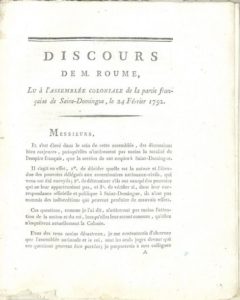Philippe-Rose ROUME (1743-1805) commissaire-ordonnateur de l'île de Tobago, puis commissaire du directoire exécutif à Saint-Domingue. Imprimé, Discours de M. Roume, lu à l'Assemblée coloniale de la partie française de Saint-Domingue, le 24 février 1792(Au Cap-Français,chez Batilliot jeune et comp. Imprimeurs) ; in-4 de 17 pages, reliure moderne demi-maroquin rouge.