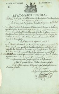 Copie conforme d'un arrêté du Procureur de la Commune. « Le Conseil général de la Commune délibérant sur les dangers de la Patrie ; considérant qu'une des principales causes de ces dangers existe encore dans l'ancienne nomination des officiers de l'Etat-Major et de tous les officiers des bataillons de l'armée Parisienne [...] arrête que dans le jour M le Commandant général donnera les ordres pour que tous les bataillons réduits à quarante huit soient rassemblés [...] et que là, confondus avec leurs frèresde la troupe armée, il sera procédé dans le jour de demain au plus tard à la nouvelle élection de tous lesofficiers de l'armée Parisienne »...