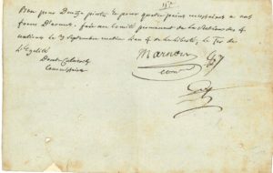 MASSACRES DE SEPTEMBRE. P.A.S. par DORAT-CUBIÈRES, commissaire, cosignée par le commissaire Marnois, « au Comité permanent de la Section des 4 nations le 3 septembre matin l'an 4 de la Liberté, le 1er de l'Égalité » [1792] ; demi-page oblong in-8.