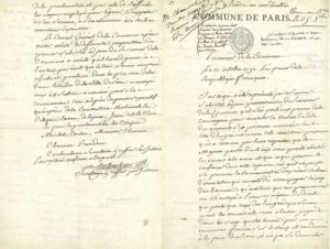 [Jacques-René HÉBERT (1755-1794) le violent pamphlétaire duPère Duchêne, substitut du Procureur de la Commune de Paris, arrêté avec ses partisans et guillotiné.] P.A.S. par Claude COULOMBEAU, « secrétaire greffier par interim », Paris 21 octobre 1792 ; 3 pages in-fol., vignette et en-tête de la Commune de Paris.